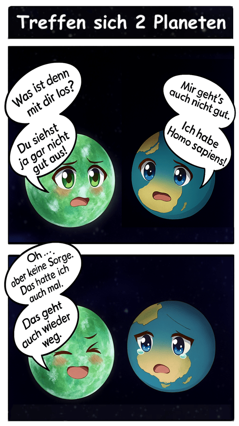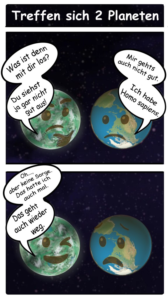 Der Witz zeigt aber auch noch etwas anderes auf, nämlich, dass wir als Menschheit den Planeten nicht wirklich zerstören werden. Wir werden uns maximal die Lebensgrundlage entziehen (oder wie man so schön sagt, den Ast absägen, auf dem wir sitzen). Der Planet hat immer wieder gezeigt, dass er es auch nach Katastrophen schafft, Leben neu zu erschaffen.
