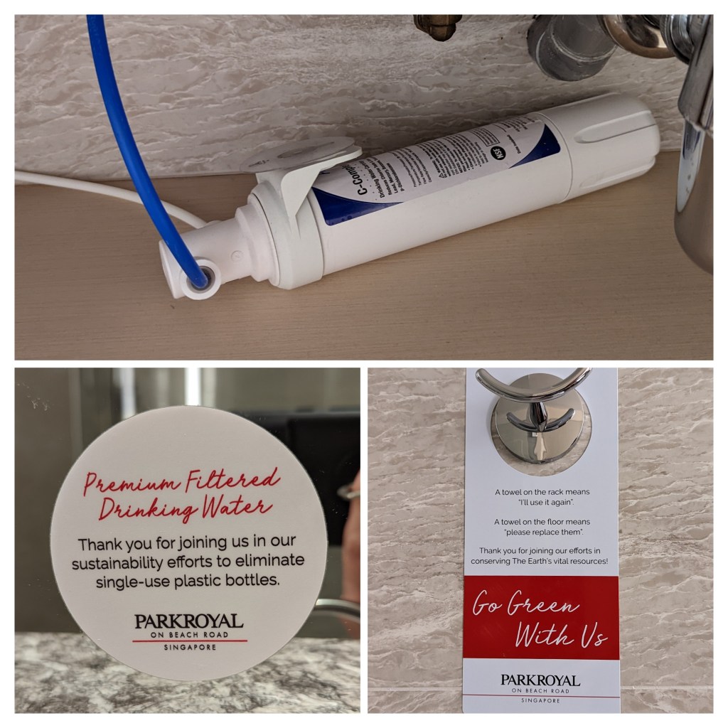 09:30 Uhr – Grüne Stadt: Singapur will die erste grüne Stadt der Welt werden. Im Hotel haben wir dies hier entdeckt, einen Trinkwasseraufbereiter + Hinweisschild, dass man damit Plastik spart.
