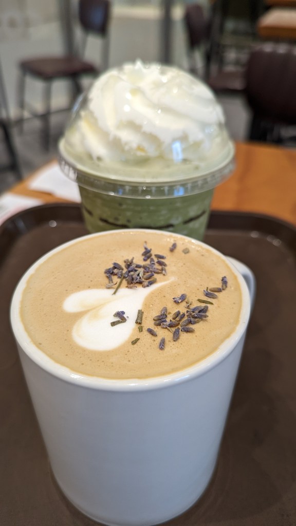 10:00 Uhr – Jetzt erst mal ’nen Kaffee: Wenn wir nicht einchecken können, checken wir jetzt zunächst die Stadt ein wenig. Bei dem Hotel wird mächtig gebaut. Zum Glück gibt’s um die Ecke gleich ein Café. Koffein ist genau das, was ich jetzt brauche ☕. Und es gibt hier sogar eine Kreation, die ich bisher nicht kannte. Lavendellatte mit echten Lavendelblüten (ich wusste gar nicht, dass man so was essen kann)