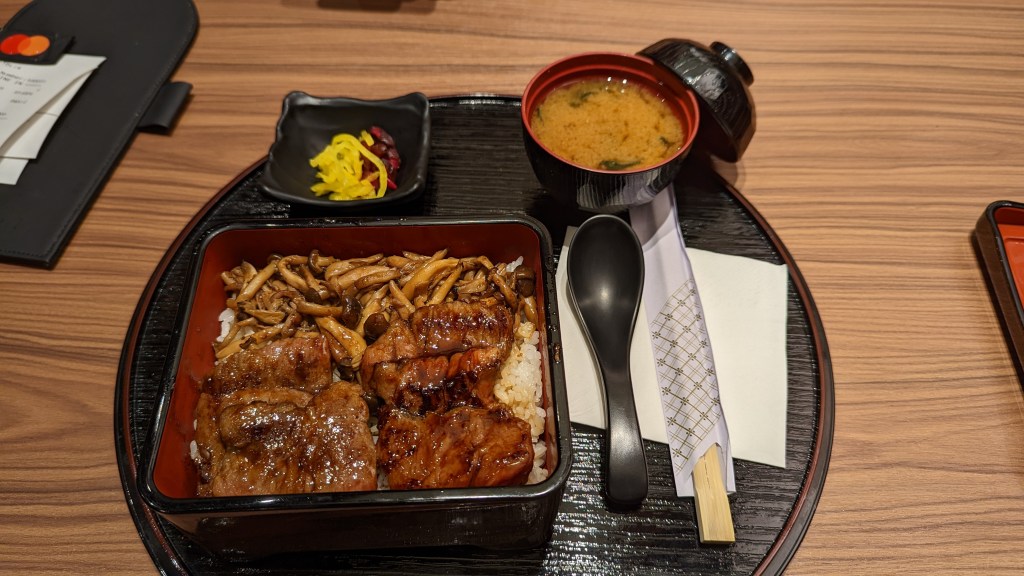 14:00 Uhr – 1x Wagyu auf Reis, bitte: Wir müssen unbedingt was essen. Mein Körper schreit nach Energie. Wenn die Auswahl nicht so gigantisch wäre, hätte ich mich auch schneller entscheiden können. Ja, ich weiß, wir haben „echte“ Probleme 😂. Am Ende habe ich mich für das hier entschieden.