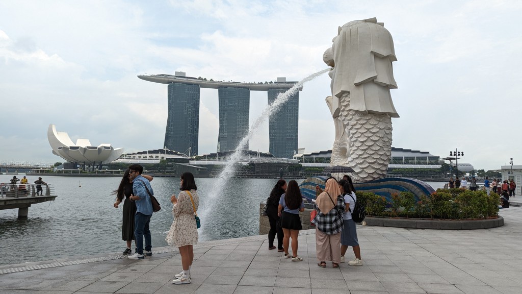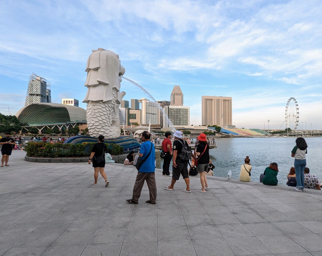 13:00 Uhr – Maskottchen von Singapur: Wir sind endlich vollzählig. Los geht’s, als Erstes einmal um das Hafenbecken zum Maskottchen von Singapur, Merlion.