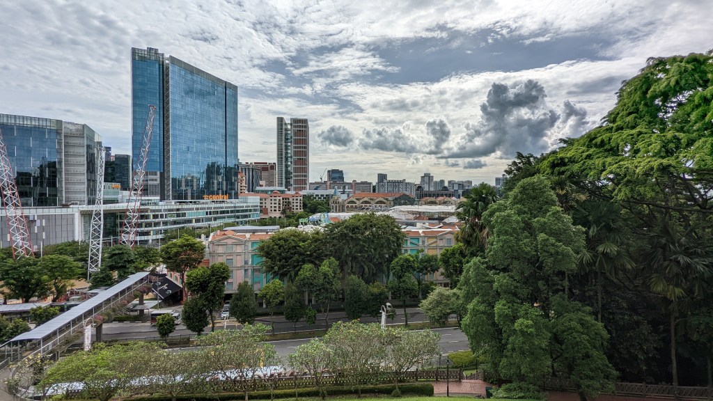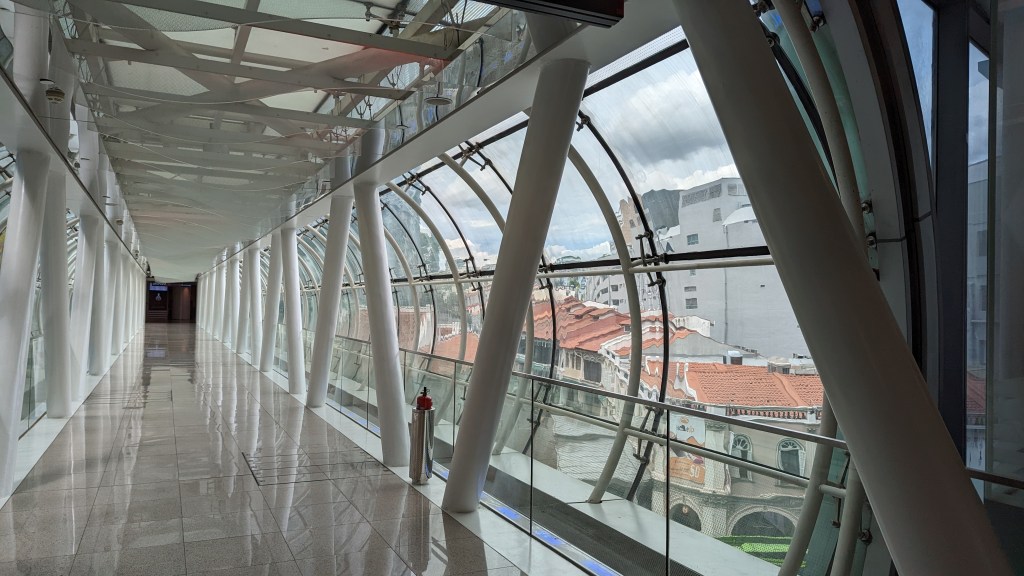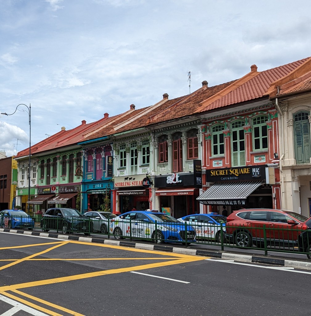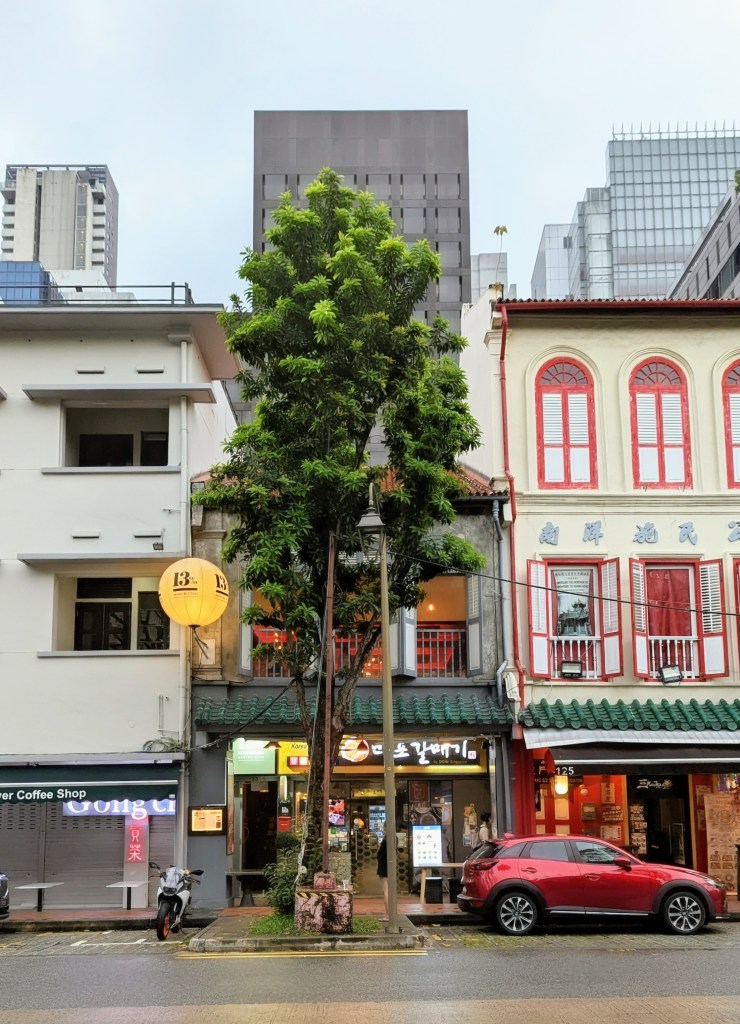 14:00 Uhr – Und weiter geht’s: Wir queren gerade die Orchard Road über die Link Bridge. Hinter einem der Kaufhäuser sehen wir ein paar alte Häuser. Ich bin mir aber gerade nicht sicher, ob diese Originale sind. Schön sieht es trotzdem aus.