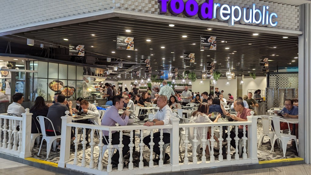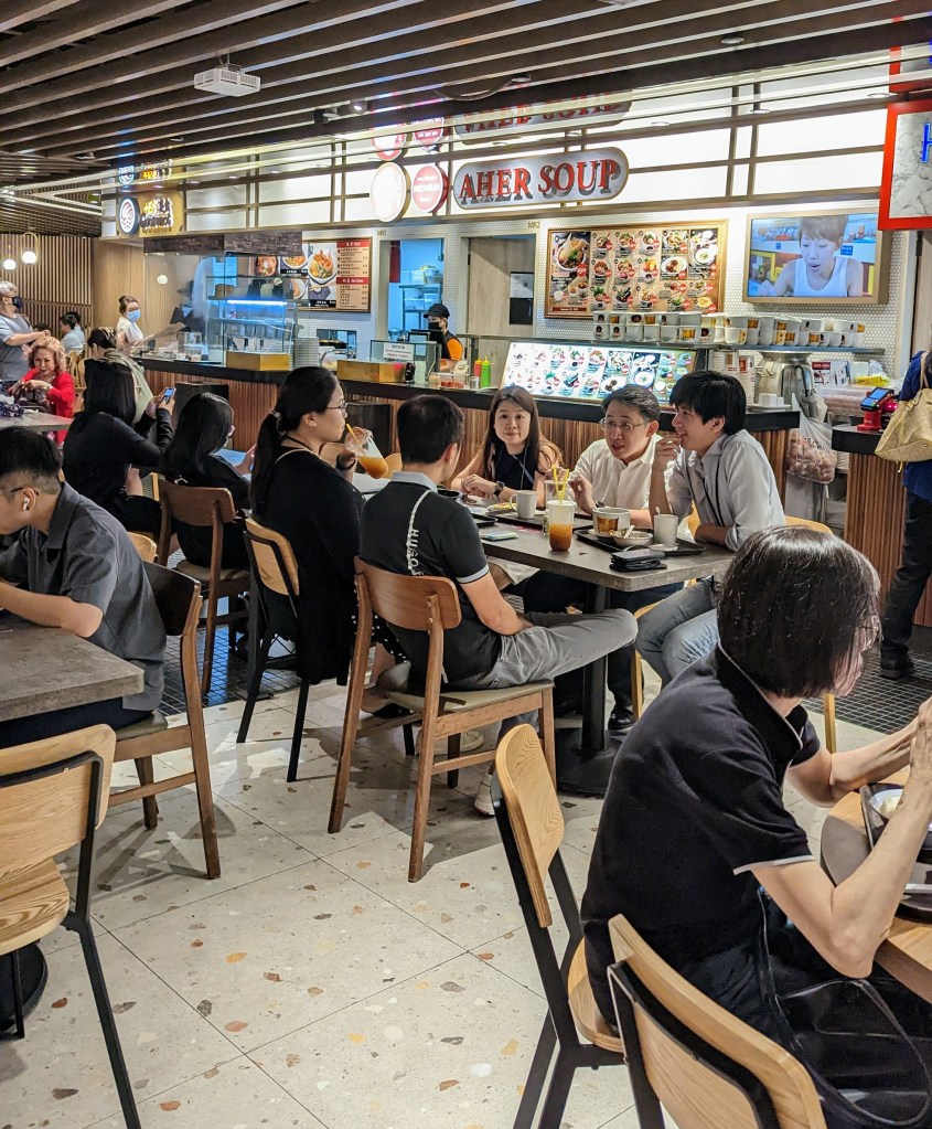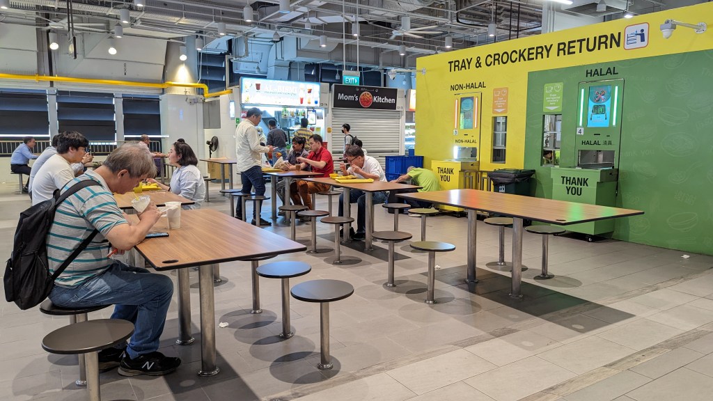 15:30 Uhr – Foodcourt mit Halal Food: Wir sind gerade in einem Foodcourt mitten im Geschäftsviertel von Singapur. Dieser befindet sich in der 2. & 3. Etage eines Wolkenkratzers. Was ich hier zum ersten Mal gesehen habe, sind Rückgabebereiche für Geschirr, die getrennt sind nach Halal und Non-Halal.