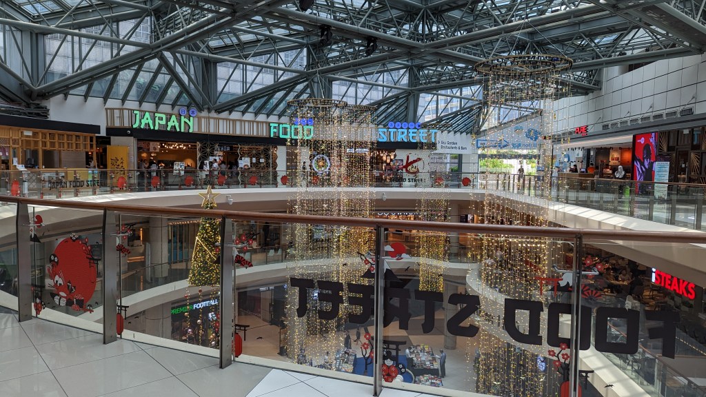 12:00 Uhr – Shoppingcenter Tour: Wir werden hier gerade auf der Hauptstraße mit Weihnachtsmusik beschallt. Bei 28 Grad fühlt sich dies alles etwas unwirklich an.