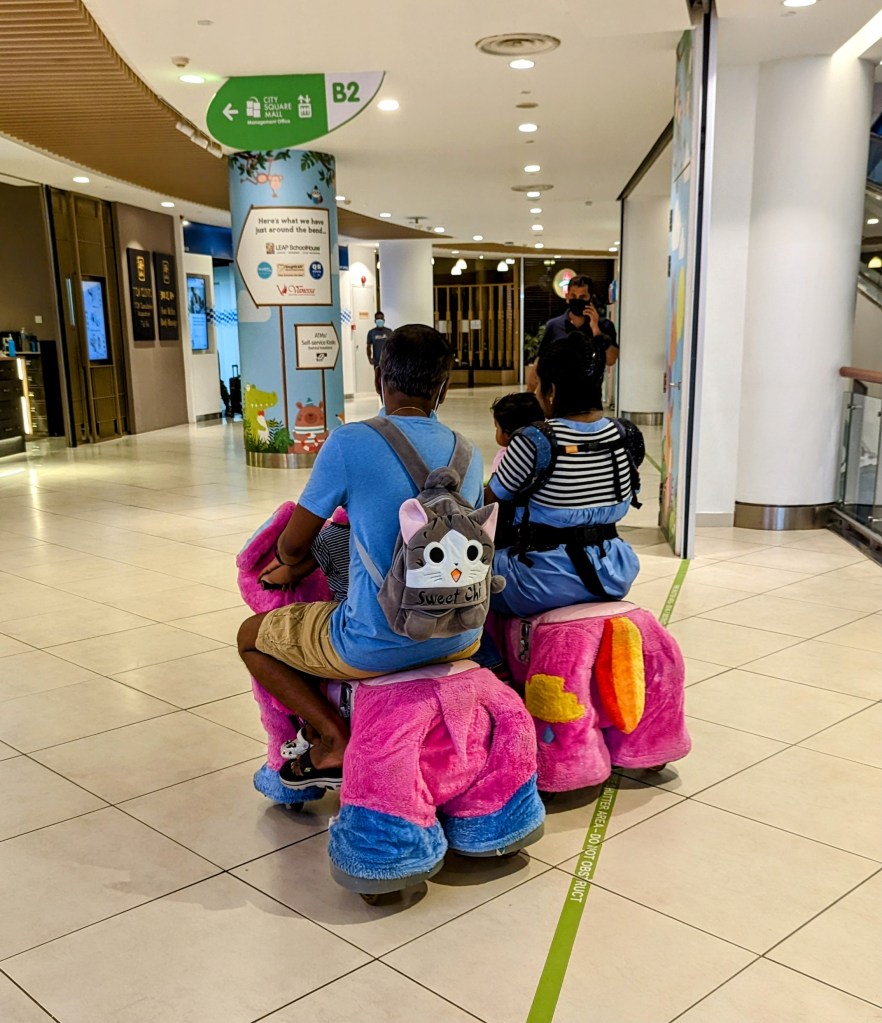 Wir suchen gerade was zu essen, als wir das hier gesehen haben. Ich habe den Eindruck, mehr Spaß kann man mit Kindern in einem Shoppingcenter nicht haben. 😂
