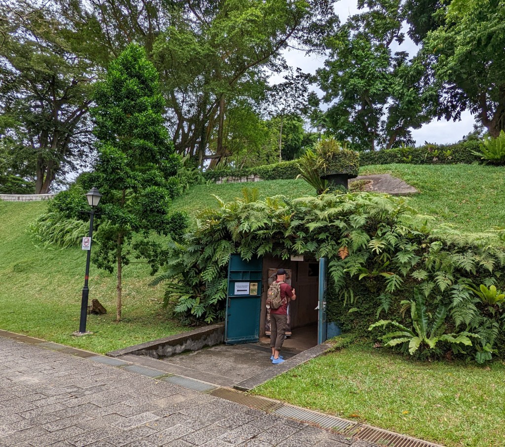 15:00 Uhr – Fort Canning Park: Wir befinden uns jetzt auf einem Hügel, auf dem früher ein Fort der Briten stand. Heute gibt es hier noch eine Militäranlage. Und unterhalb des Hügels verläuft ein Bunker, von dem wir aber nicht wissen, wo dieser herauskommt. Den Eingang haben wir aber schon mal gefunden.