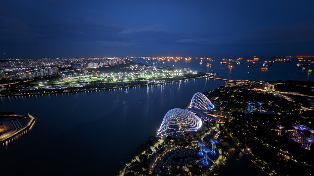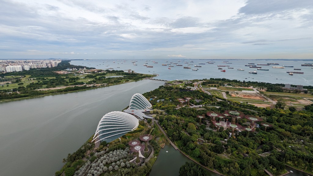 17:30 Uhr – Aussicht genießen: Wir haben unser letztes Ziel für heute erreicht, das Observation Deck des Marina Bay Sands Hotel. Die Aussicht ist der Wahnsinn. Aber vor allem bin ich über die vielen Schiffe überrascht, die hier in der Straße von Singapur liegen. Dies sind eindeutig mehr als 2020.