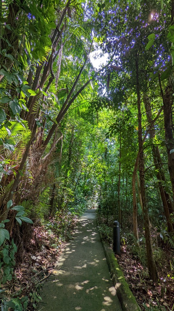 14:30 Uhr – Im Dschungel: Hier auf Sentosa gibt es mehrere schmale Pfade, die durch den neu angelegten Dschungel führen. Diesen hat man hier wieder aufgeforstet. Wenn man kein Hinweis dazu gefunden hätte, könnte man denken, der steht schon immer so hier.