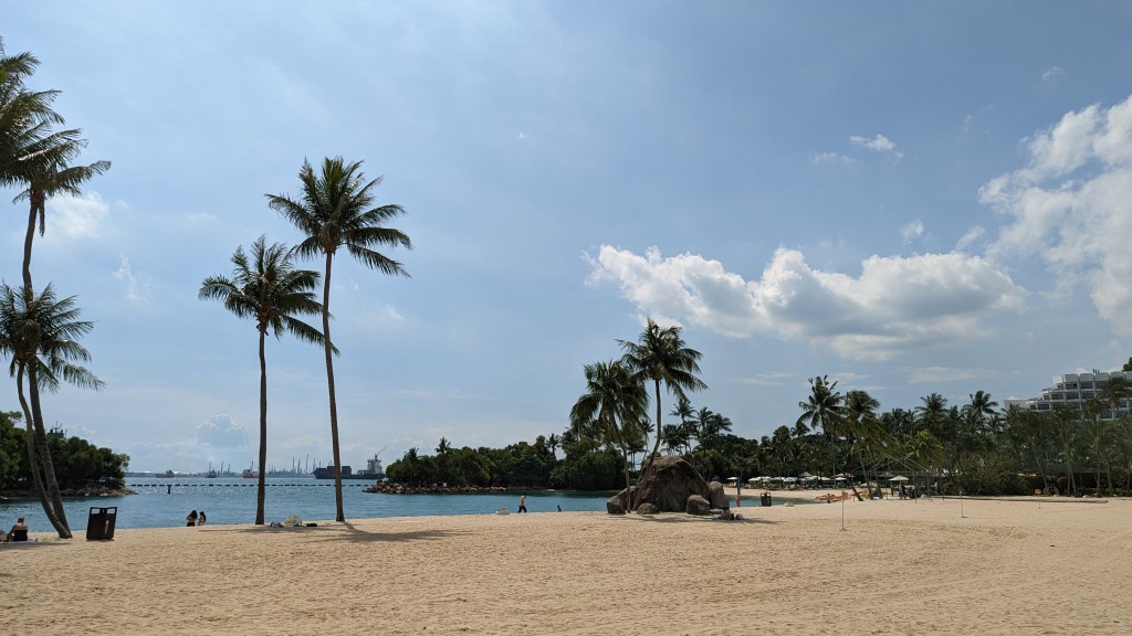 Jetzt geht es zurück nach Sentosa. Wir nehmen diesmal die Promenade und laufen am Ufer entlang. Wetter ist geil. Aber die ganzen Automaten sind verschwunden, die 2020 hier noch standen.