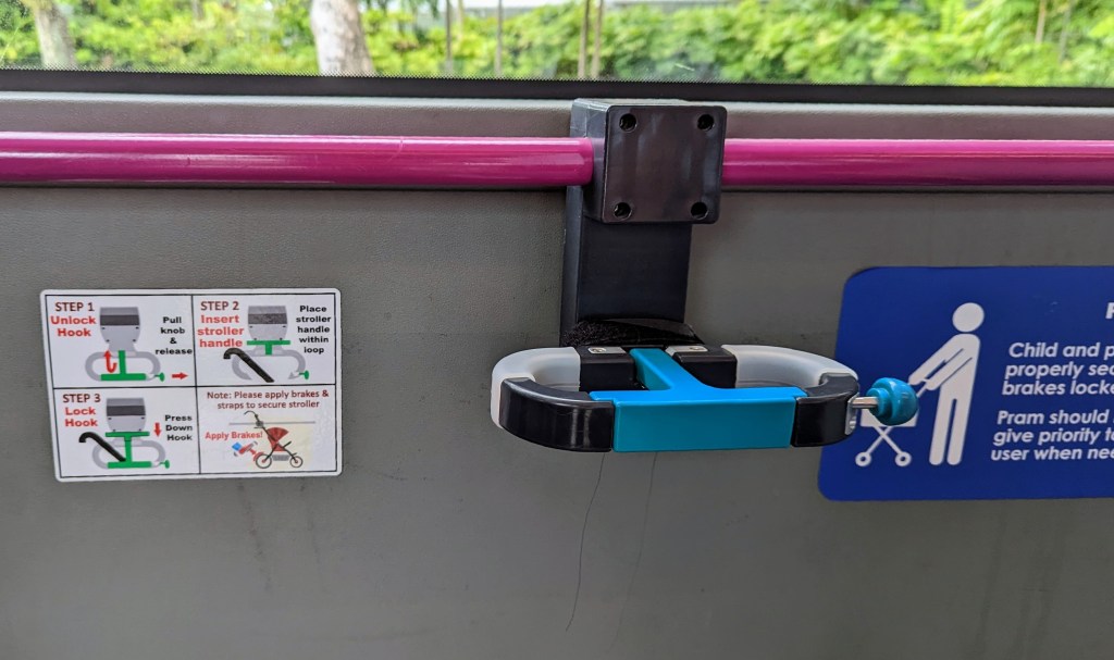 14:30 Uhr – Halterung für Kinderwagen: Wir sind gerade mit dem Bus zum Singapore Flyer gefahren. Im Bus ist mir diese Halterung aufgefallen. Hier kann man seinen Kinderwagen fest verankern, sodass dieser nicht wegrollt. Ziemlich praktisch, finde ich 😊.