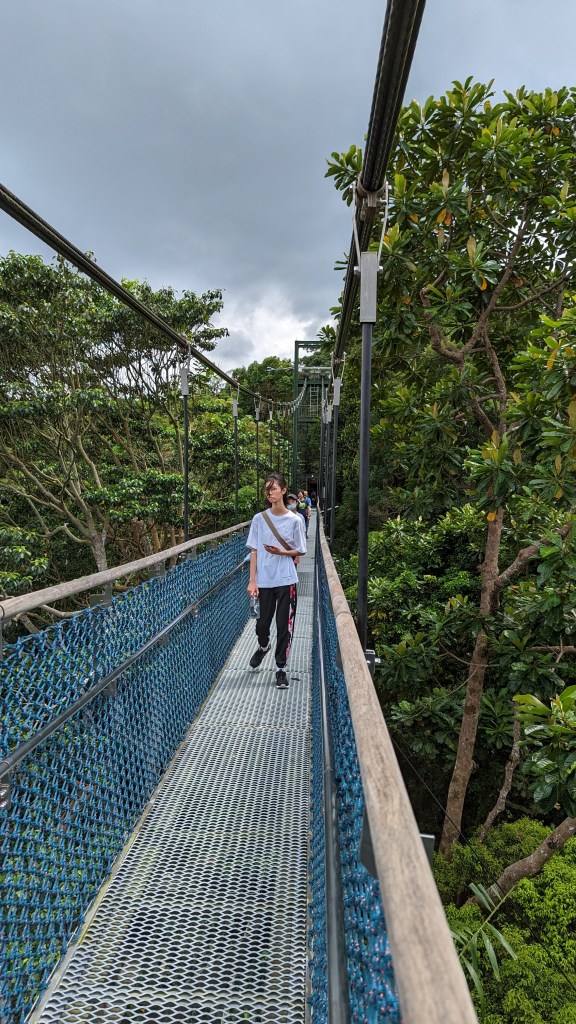 13:00 Uhr – Hängebrücke: Wir sind am „Tree Top Walk“ angekommen, einer sehr langen Hängebrücke, die hier durch den Dschungel führt. Sie ist stabil, wackelt aber trotzdem ein wenig. Die Aussicht von ihr ist jedoch wunderschön.
