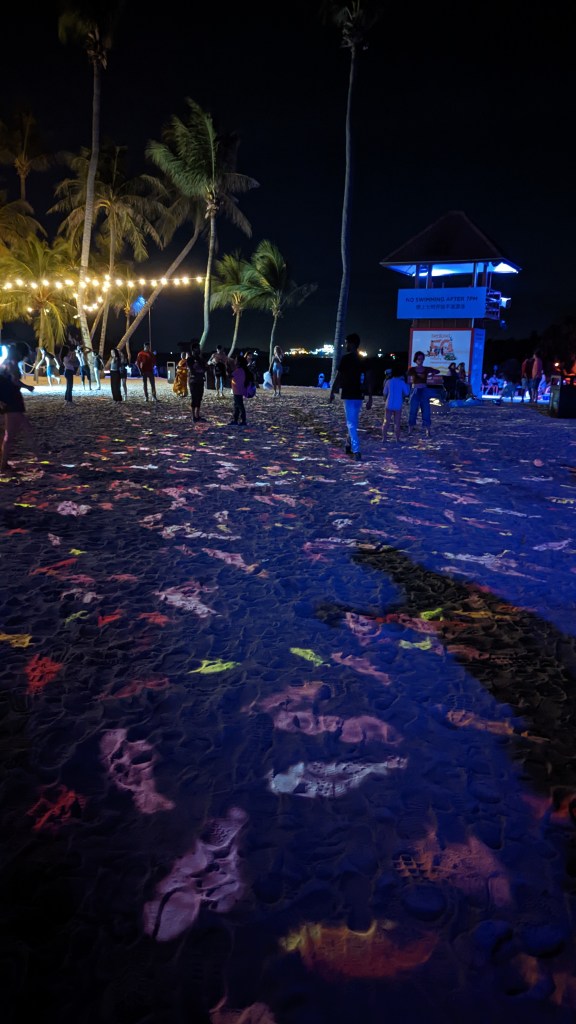 19:30 Uhr – Illumination am „Sentosa Beach“: Als Highlight des heutigen Tages hatte ich mir noch die Illumination am „Sentosa Beach“ herausgesucht. Das Wetter war perfekt dafür. Ich hatte auch das Gefühl, das heute mehr los war. Scheinbar sind mehr Touristen am Strand gewesen. Es war toll, und noch ein gelungener Abschluss des Tages.