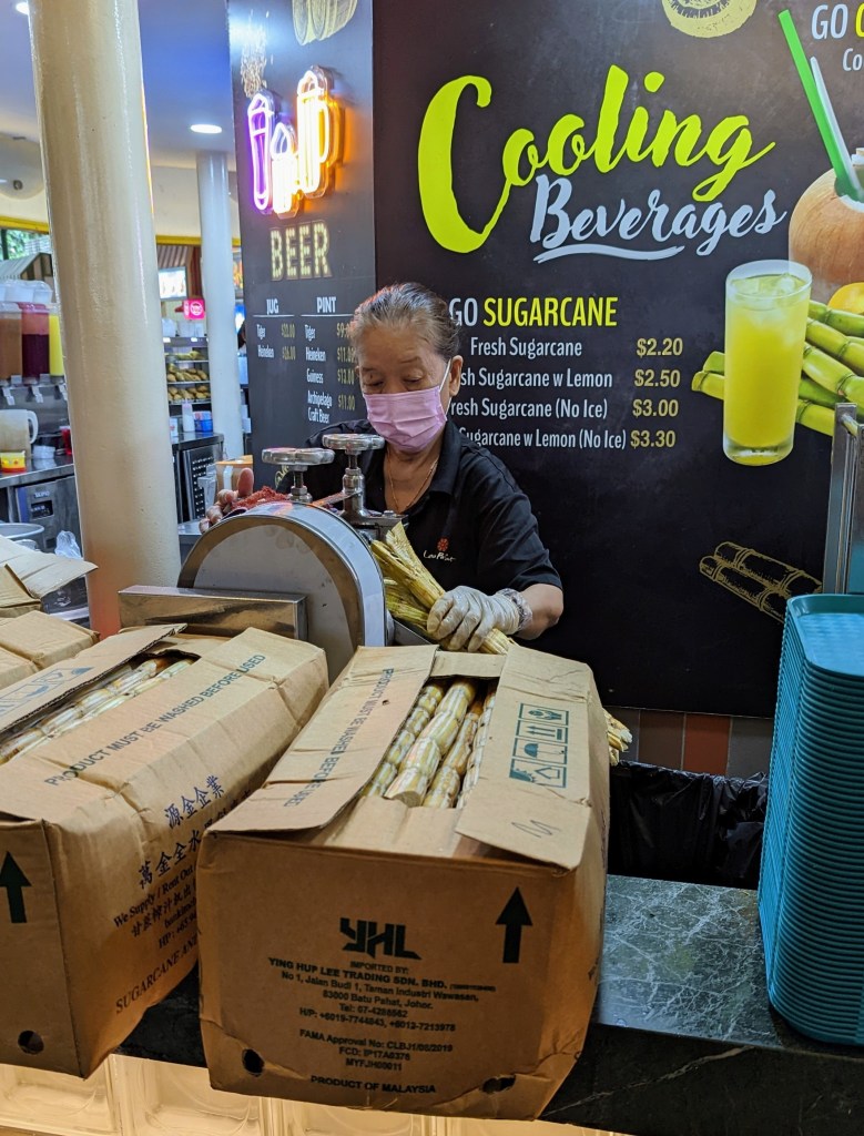 17:00 Uhr – Lau Pa Sat Foodcourt: Wir sind im „Lau Pa Sat Foodcourt“. Dieser befindet sich unter einer alten viktorianischen Kuppel. Er ist riesig und wir probieren jetzt gerade mal einen Saft aus frisch gepresstem Zuckerrohr. Yummy, yummy 😋
