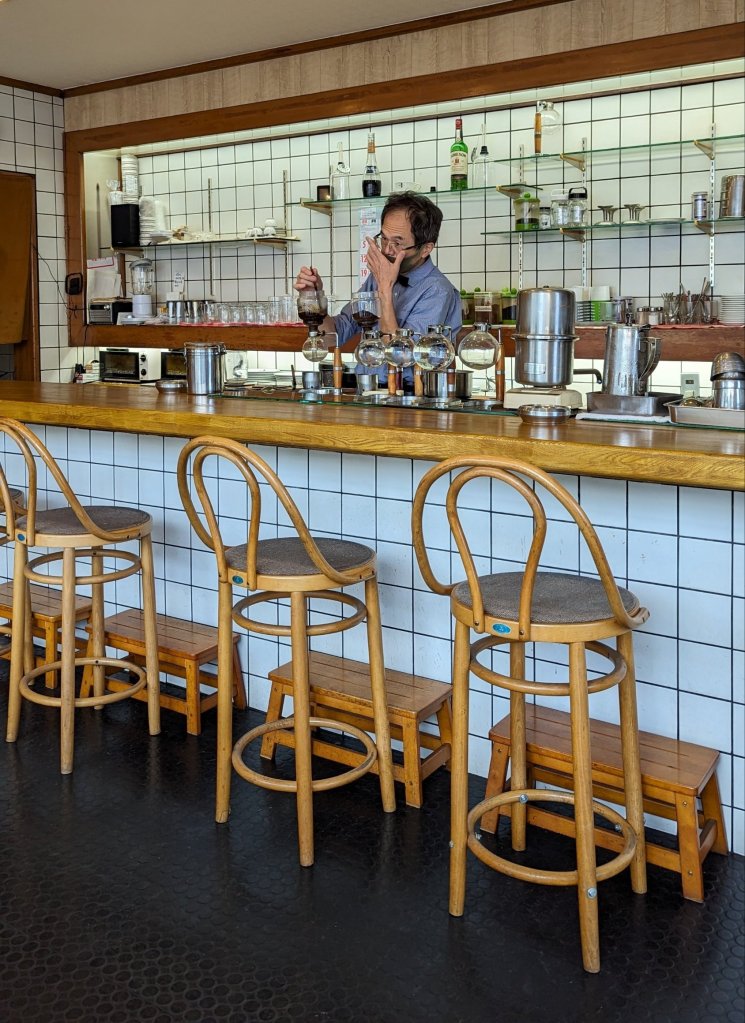 Das Café sieht urig aus. Auf einem Schild steht es wurde 1955 eröffnet und es ist das erste Café in Kyoto gewesen, welches Syphon Kaffee zubereitet hat. Der Inhaber sieht aus, als ob er das Café gegründet hätte. Er legt an den Syphons los und kreiert uns unseren Kaffee.