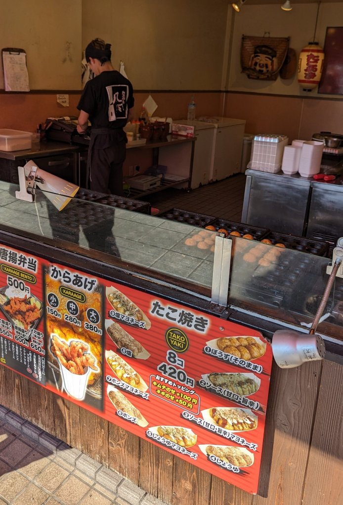 18:30 Uhr: So langsam schmerzen mir die Füße. Wir müssen erstmal eine Pause machen. Takoyaki steht noch auf den Programm. Schließlich sind wir in der Stadt aus der dieses Gericht stammt. Schnell mal googeln und siehe da, ein kleinen Stand gefunden der verschiedene Varianten anbietet. Echt Top und dass für 1.000 Yen (ca. 7 Euro).