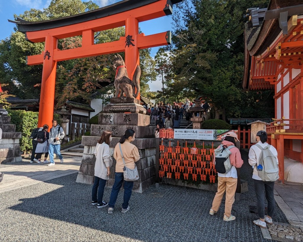 11:30 Uhr: Wir sind in Kyoto angekommen. Richtig viel los hier, Touristen ohne Ende. Die Gehwege sind voll und man kommt nur langsam vorwärts. Wir arbeiten uns Stück für Stück zum nächsten Ziel vor. Ablenkung pur auf beiden Straßenseiten, überall gibt es was leckeres zu Essen.
