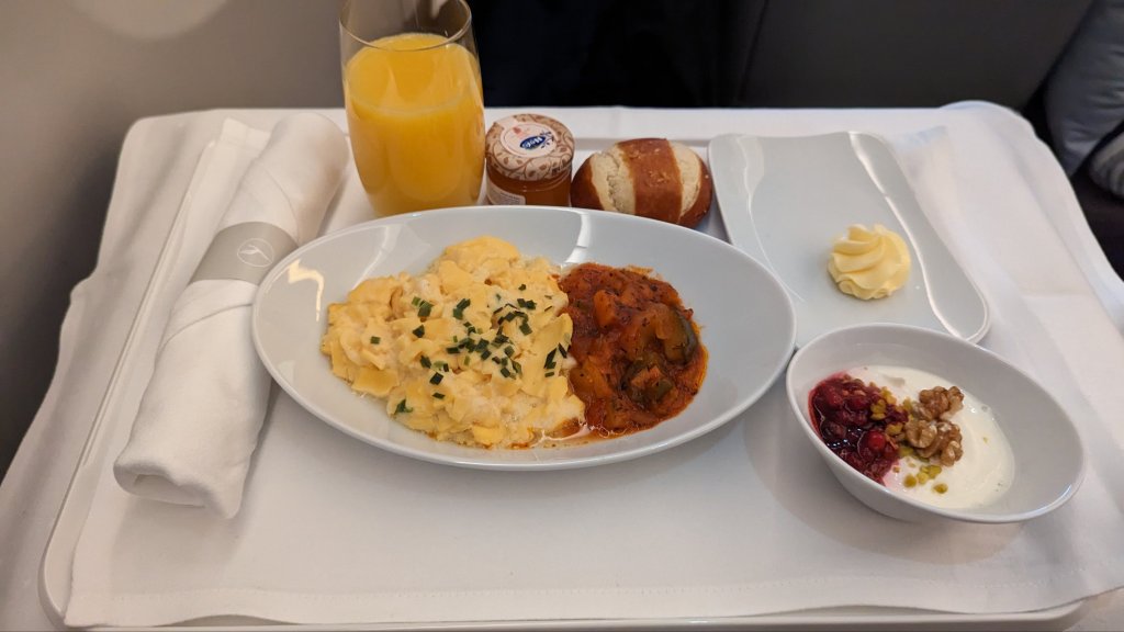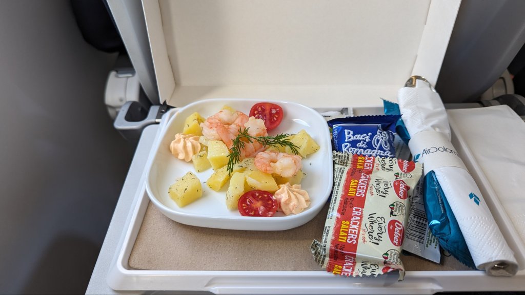 Ich habe diesmal gleich einen Business-Class Flug gebucht, nach den guten Erfahrungen im letzten Jahr. Der Flug wurde diesmal von AirDolomiti durchgeführt, weswegen der Snack auch italienisch angehaucht war. Sehr lecker, besonders das Olivenöl mit dem Salz 😋
