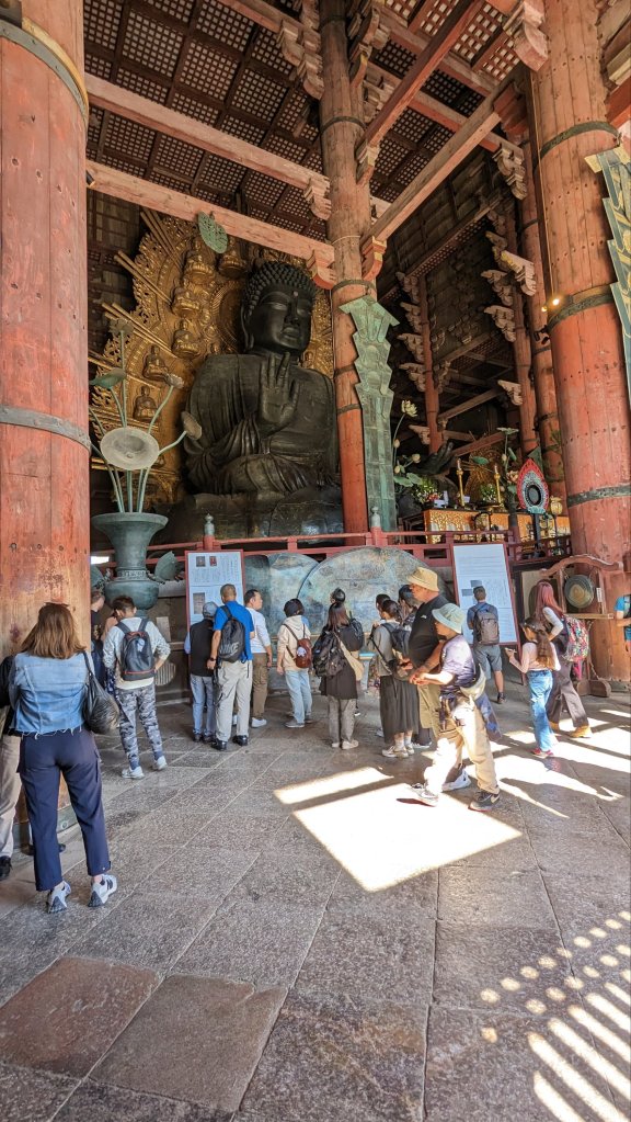 Jetzt haben wir den Tōdai-ji Tempel erreicht. Es soll das größte rein aus Holz gebaute Gebäude der Welt sein, laut der Wikipedia. Im Inneren sitzt ein großer Buddha, flankiert von kleineren Buddhas. Sehr beeindruckend.
