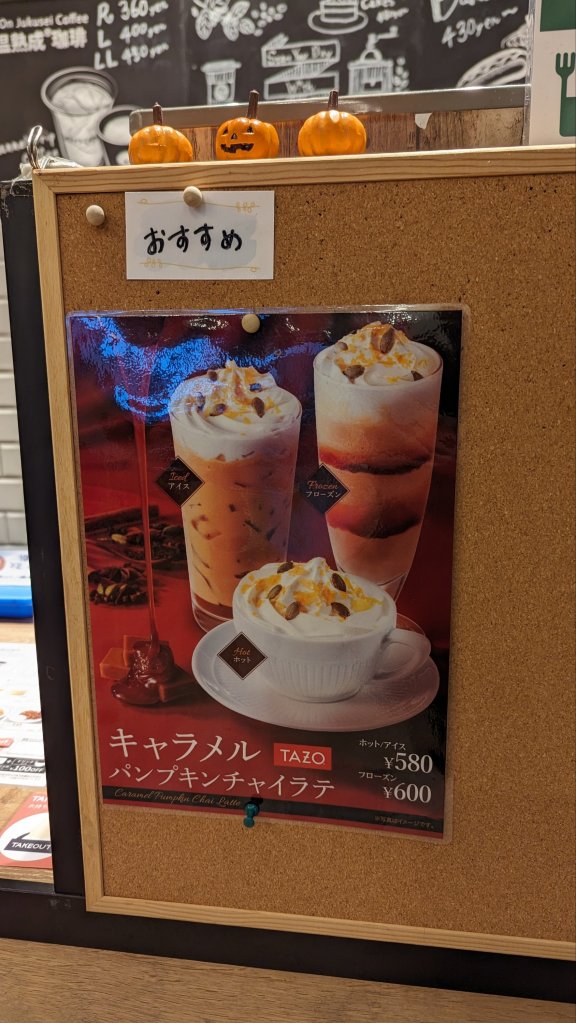 14:30 Uhr: Wir sind zurück in die City gefahren. Jetzt erstmal einen leckeren Kaffee. Es gibt hier zu nahezu jeder Jahreszeit Special Kreationen an Getränken und Essen. Heute ist der letzte Tag für die Halloween Edition. Ab morgen wird es dann schon die ersten Weihnachtseditionen geben.