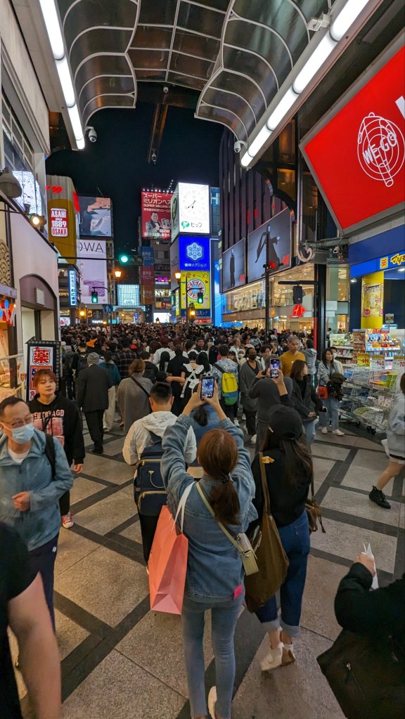 18:00 Uhr: Wir haben nochmal einen Abstecher zur Dotonbori unternommen. Hier soll heute Abend Halloween stattfinden. Wenn es genauso wird wie das Halloween was wir 2019 in Tokio erlebt haben, wird es einmalig sein.