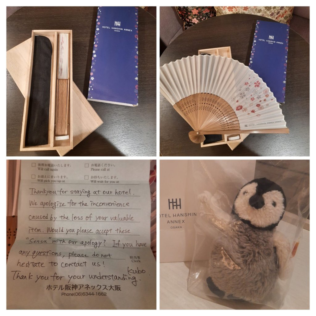 Gestern Abend war es dann soweit. Wir konnten das Plüschtier von der Rezeption abholen. Doch nicht nur dass, wie bekamen zusätzlich als kleines Geschenk 2 japanische Fächer in einer Holzkiste. Dazu ein Entschuldigungsschreiben auf Englisch und das Plüschtier eingepackt in einer Plastiktüte.