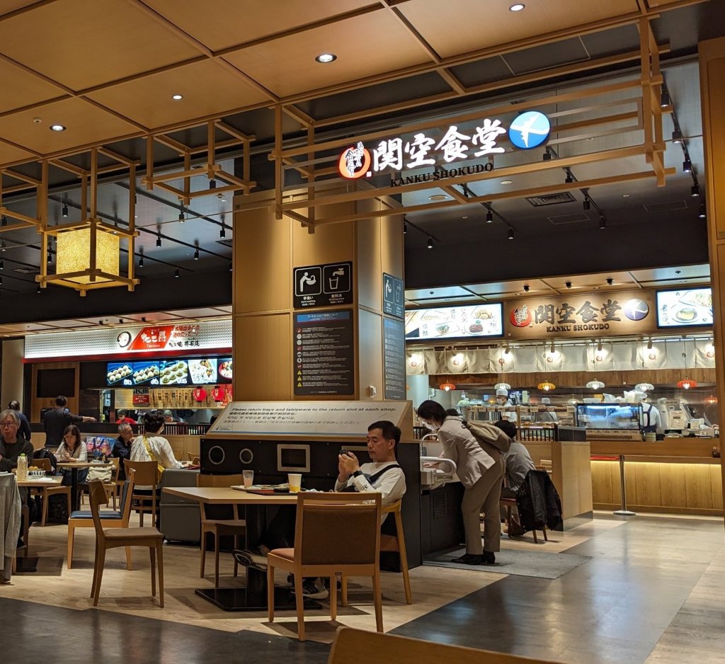 Der Kansai Flughafen wird gerade fit für die Expo 2025 gemacht. Deswegen wird hier gerade eine neue Restaurant-Street gebaut. Trotzdem gibt es eine gute Auswahl an Essensmöglichkeiten und einen großen Food-Court mit typisch japanischen Gerichten. Hier werden wir etwa finden.