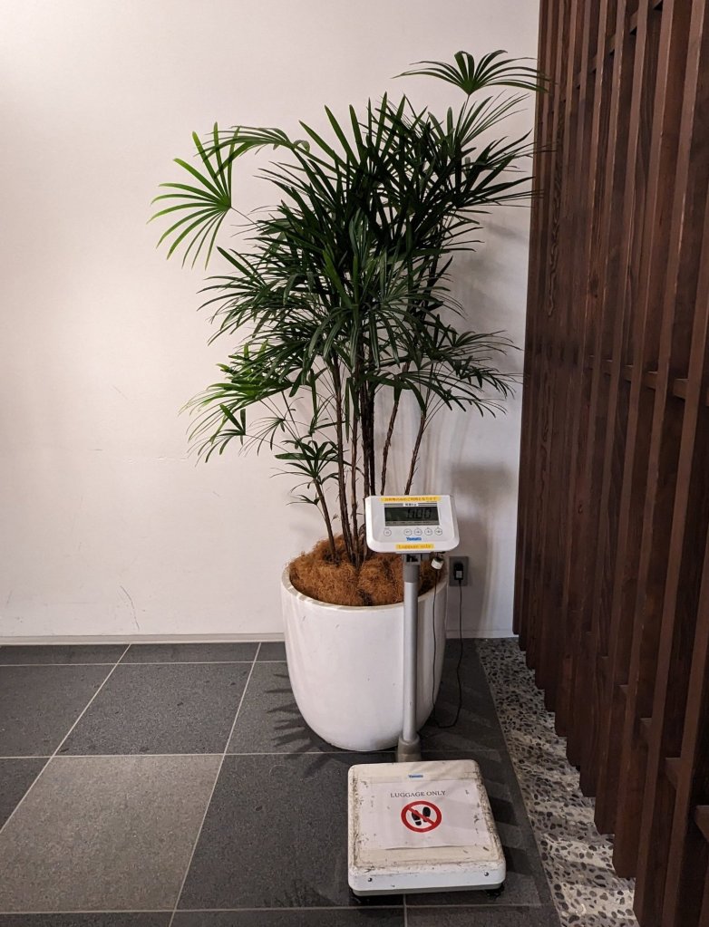 Gestern Abend habe ich mir noch gedacht, wie cool wäre es, wenn es im Hotel eine Waage gäbe, um das Gepäck zu wiegen. Und was sehe ich hier in der Lobby? Sie haben echt an alles gedacht. Ich bedanke mich nochmal auf japanisch für den tollen Service.