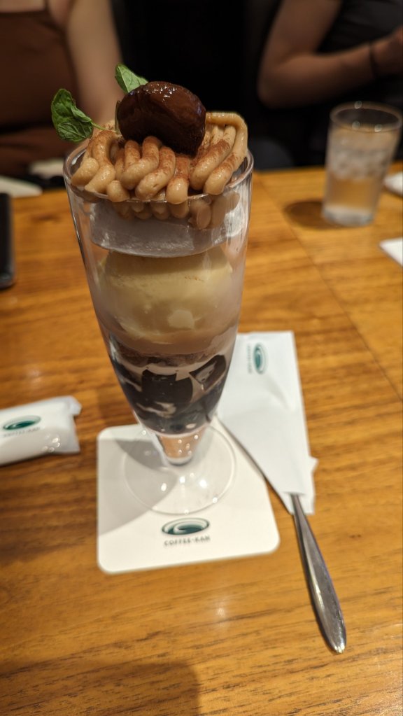 Nachdem wir hier kurz verweilt haben, legen wir das nächste Ziel fest, den Ghibli Store in Namba. Ein bisschen laufmüde sind wir aber bereits. Deswegen erstmal ein Café. Auf dem Weg fällt uns dieser Laden auf, in dessen Schaufenster mich dieses leckere Dessert anspricht.