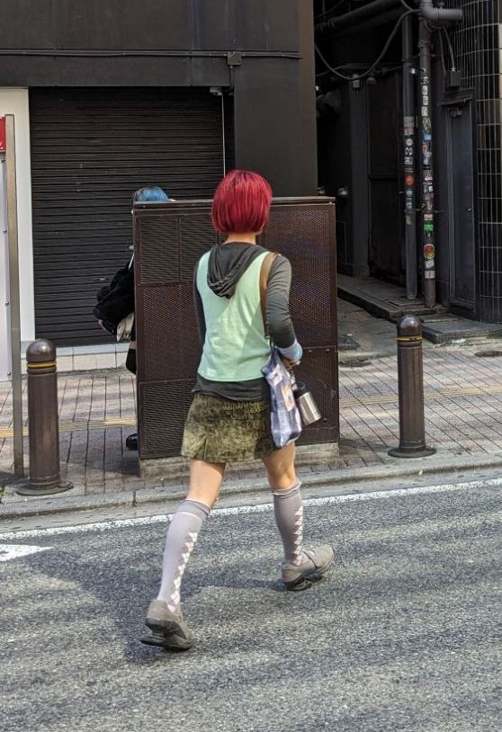 Mir fällt gerade eine Frau auf, die Schuhe mit Dämpfern anhat. Ausgefallene Designs sieht man immer wieder hier in Tokio. Man muss nur aufmerksam bleiben.