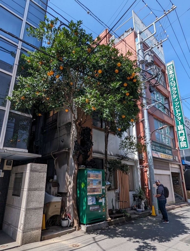 Noch ist es ruhig. Trotzdem schon wieder eine große Menge an Impressionen. Wir bleiben immer mal wieder stehen. Was uns ins Auge fällt, ist der hübsche Orangenbaum. Oha, an dem steht auf dem Getränkeautomaten sogar eine Figur. Was sie wohl darstellen soll?