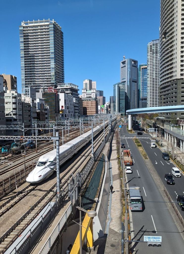 13:00 Uhr: Gleich neben dem japanischen Garten haben wir einen Hochweg entdeckt. Den wollen wir jetzt noch mal erkunden, da wir noch etwas Zeit haben. Oh, sehr schön, von dem Hochweg kann man gut die Shinkansen-Züge sehen.