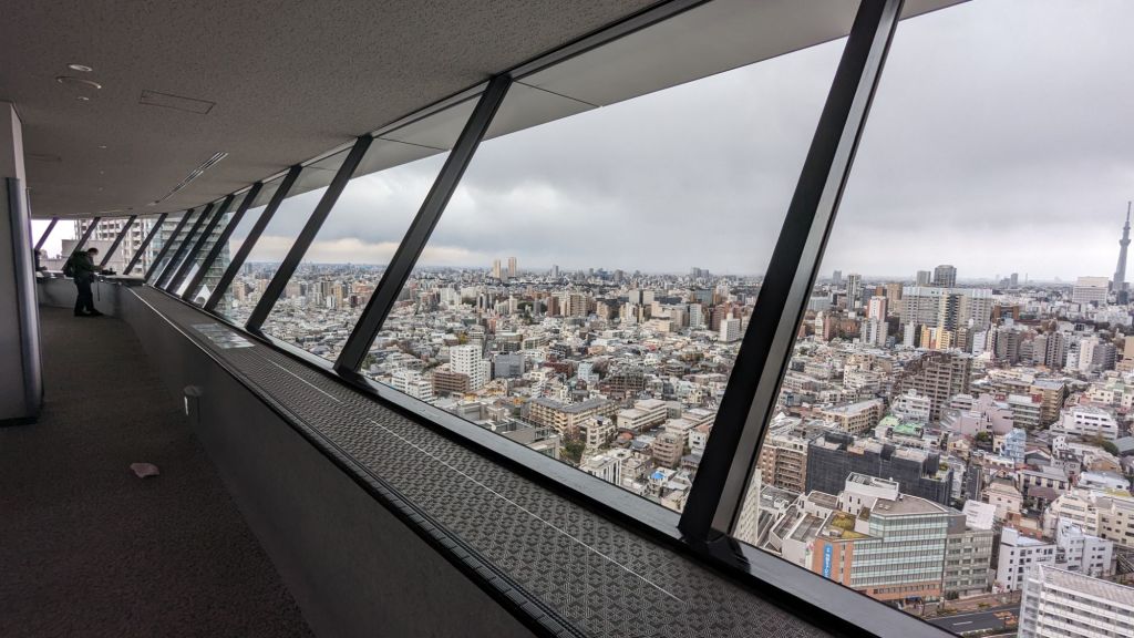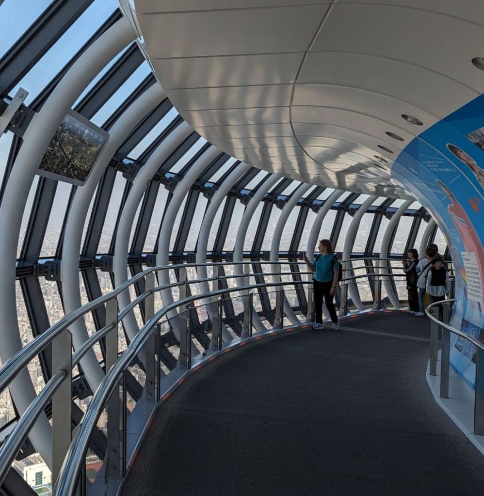 Scheinbar kommen wir auch schon nach oben auf den Skytree. Das ist gut. Also ab in den Fahrstuhl und rauf auf den Tower. Das müsste in der Zwischenzeit im Übrigen mein sechstes Mal hier oben sein. Ich finde es immer wieder beeindruckend, wie toll die Aussicht ist. Wenn man Zeit hat, würde ich im Übrigen auch immer ein Day-Ticket empfehlen, um tagsüber und am Abend hier hinaufzufahren.