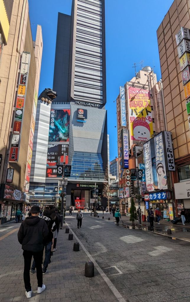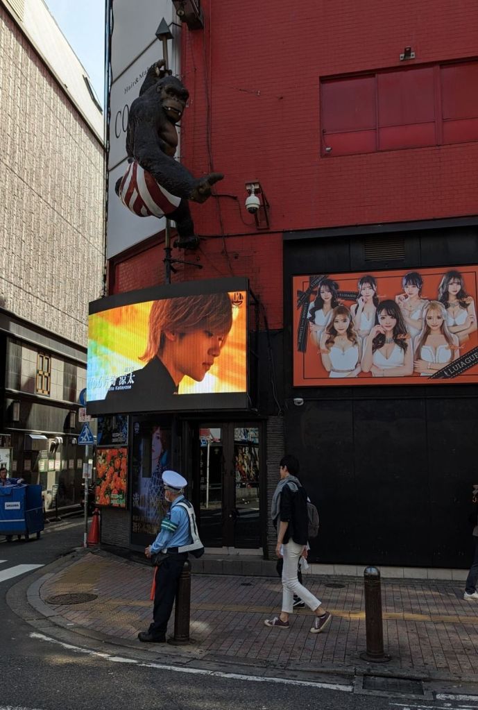 Wir sind jetzt in Kabukicho. Ich will den Anderen das Viertel noch mal am Tag zeigen. Wir werden dann später noch einmal durchlaufen, wenn die Reklametafeln leuchten. Doch erst einmal geht es zu King Kong, der hier an einem Mast hängt.