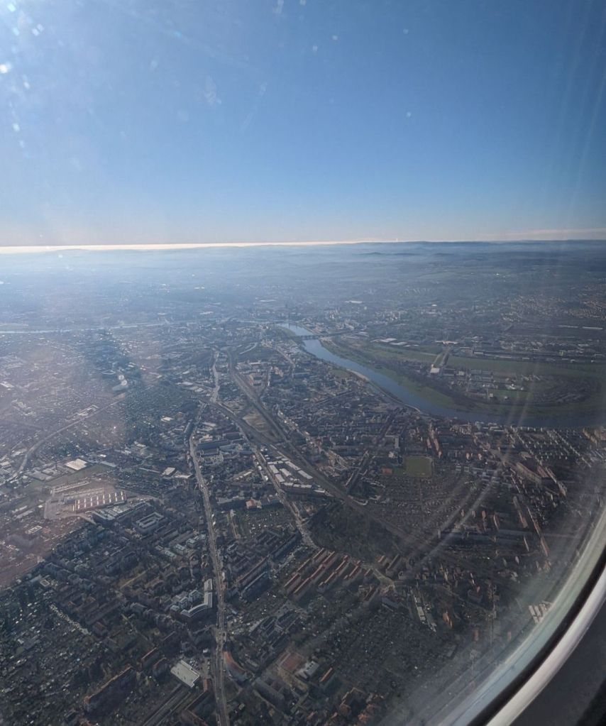 09:25 Uhr: Bye bye Dresden. Wir sind pünktlich gestartet. Das Wetter ist super und der Ausblick immer wieder schön. Bei diesem tollen Wetter kann ich sogar die Frauenkirche gut erkennen. Nur „Über den Wolken“ kann ich heute nicht trällern, weil es keine gibt. 😂