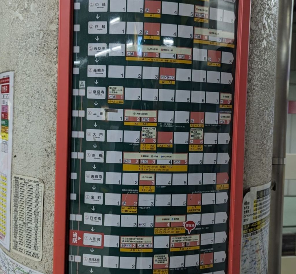 Es gibt im Übrigen in den meisten Stationen einen Orientierungsplan, mit einer Übersicht für die Linie, mit der man gerade fährt. Auf dieser sieht man, wo sich die wichtigsten Punkte der jeweiligen Station befinden, sodass man weiß in welchen Wagen man einsteigen sollte, um möglichst schnell von A nach B zu kommen.