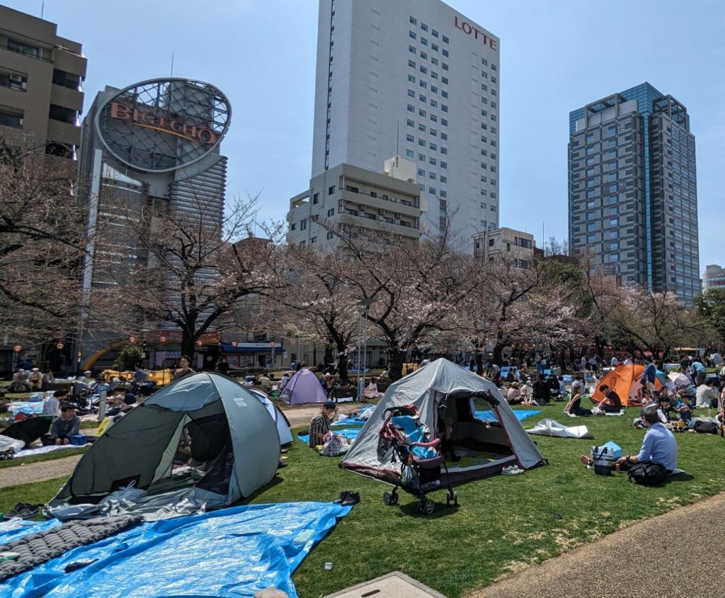 Wir kommen gerade an einem Park vorbei, an dem die Japaner Sakura feiern. Heute ist auch Sonntag, weswegen der Park gut gefüllt ist. Die meisten haben Decken oder Planen ausgebreitet, auf denen Sie jetzt ein Picknick veranstalten. Manche haben sogar kleine Campingzelte dabei.