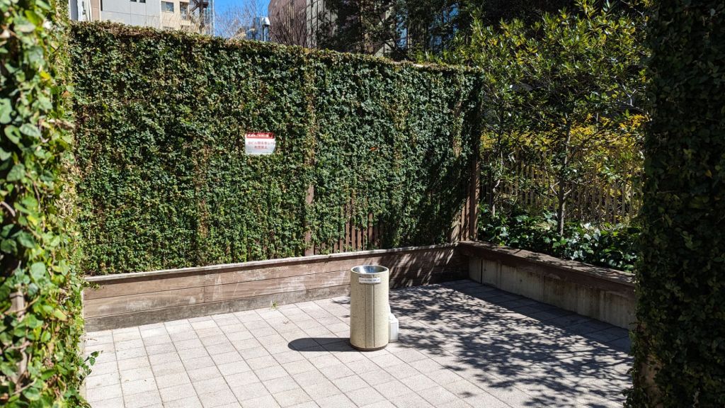 In nahezu dem gesamten öffentlichen Raum in Tokio ist das Rauchen verboten. Deswegen findet man überall immer wieder Bereiche, in denen man rauchen kann. Dieser hier ist versteckt, hinter einer großen Hecke und schnell zu übersehen, wenn man nicht weiß, wonach man suchen muss.