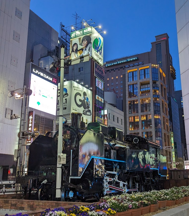 17:45 Uhr: Als wir ein Stückchen durch Ginza laufen wird der Wunsch geäußert, dass man sich dies auch noch einmal im Dunkeln ansehen möchte. Also dann, wenn hier alles beleuchtet ist. Das heißt, ich muss die Zeit für rund 30 Minuten herumbekommen. Gut, dann laufen wir einfach durch die Straßen. Ganz in der Nähe gibt es eine Lok vor einer JR Station. Diese ist heute ein Denkmal.