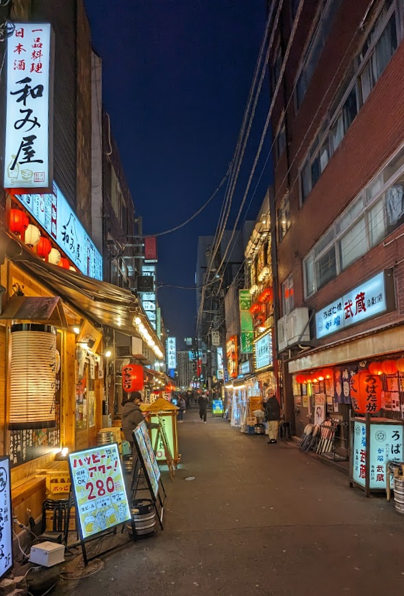 Es ist immer noch nicht wirklich dunkel. Ich brauche noch ein Ziel. Ich weiß, dass es in den Straßen in diesem Viertel viele Restaurants und Bars gibt. Dann wollen wir mal weiter laufen. So langsam können wir auch zurückgehen. Wow, wenn das kein toller Anblick ist, eine Bar neben der anderen. Alleine in dieser Gasse könnte man eine Woche täglich was anderes essen. In Tokio ist die Auswahl eben größer als das Magenvolumen, leider.