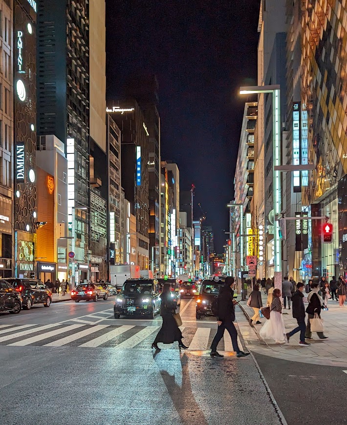 18:30 Uhr: Na endlich. Die Sonne ist komplett verschwunden. Jetzt können wir zurück nach Ginza. Die Straßen sind in der Zwischenzeit gut beleuchtet. Ginza ist nicht nur eines der schön illuminierten Viertel, sondern vor allem eins der teuersten Viertel. Normalerweise tummeln sich hier viele Chinesen aus der Mittelklasse und sind auf Shoppingtour. So hatte ich es bei meinen letzten Reisen immer wieder gesehen. Heute ist aber im Verhältnis zu damals wirklich wenig los. Wer weiß, woran das liegt.
