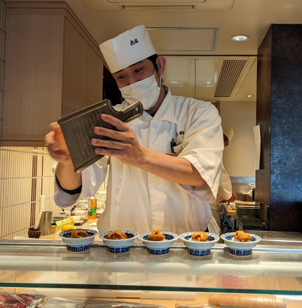 Wir werden platziert, das Menü hat man für uns extra auf Englisch ausgedruckt. Kennzeichen von solchen Restaurants sind, es gibt keine wirkliche Preisangabe. Ich weiß aber ungefähr, was hier am Ende des Tages auf uns zukommen wird.