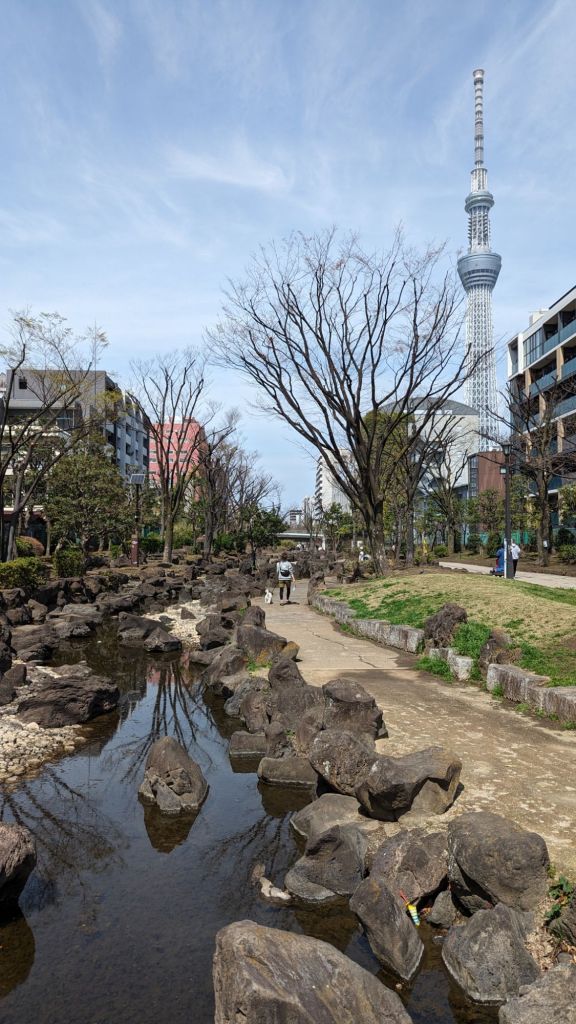 Es wird langsam Zeit zurückzulaufen. Ich entscheide mich für den Weg durch den Park, der in einem Flussbett angelegt wurde. Diesen habe ich vor ein paar Jahren entdeckt und finde ihn jedes Mal aufs neue schön. Von dem Park hat man immer wieder einen schönen Blick auf den Skytree.