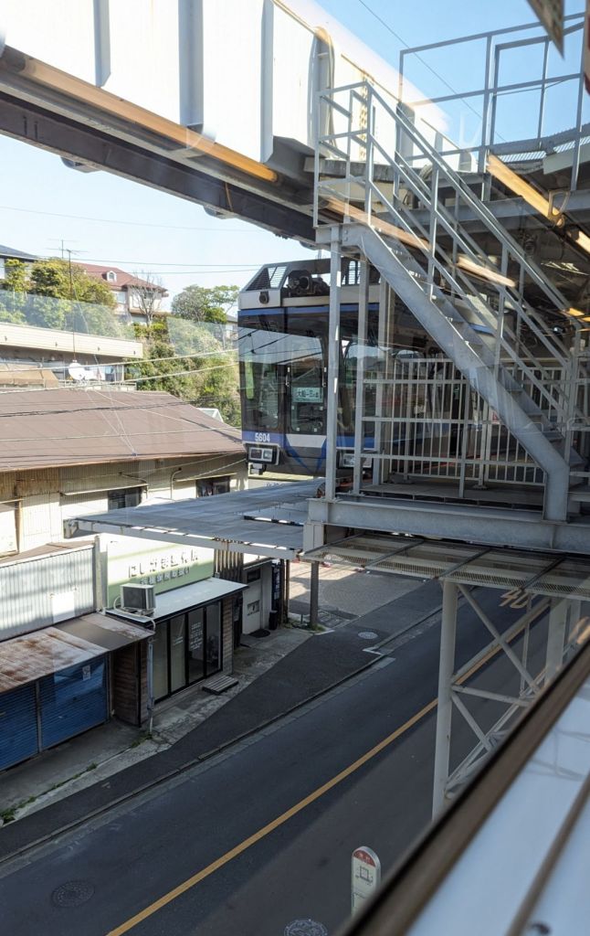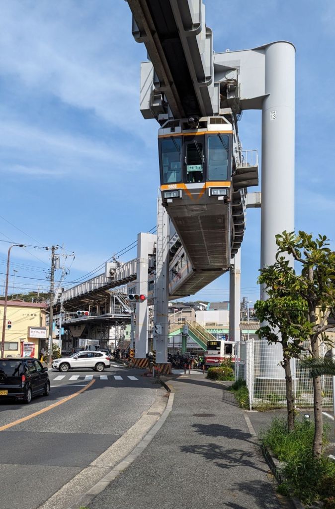 Ich fahre jetzt mit der Shonan Monorail weiter, bei der die Schienen oben sind. Diese fährt hier über einer Straße, also platzsparend in die Höhe gebaut.