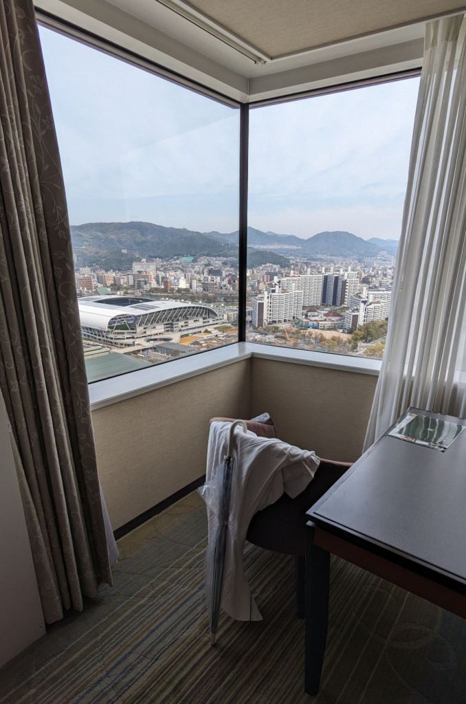 Was habe ich hier nur gebucht? Ich bin einfach nur sprachlos und verstehe nicht, wie mir das passieren konnte. Mein Zimmer befindet sich in der 28 Etage, wahrscheinlich in einem der höchsten Gebäude hier in Hiroshima. Und das Zimmer hat ein Eckfenster, sodass ich einen gefühlten 180° Rundumblick über die Stadt habe. Ich bin einfach nur happy.
