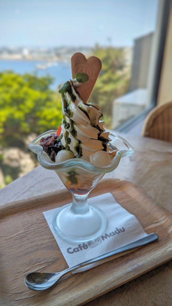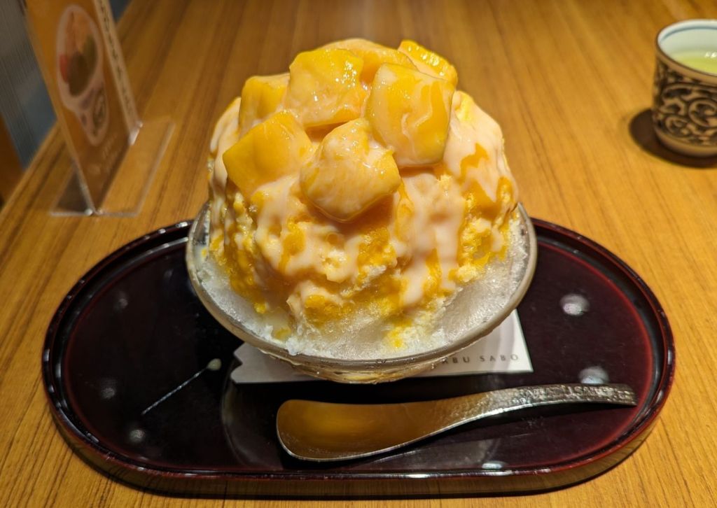 Eigentlich wollte ich ja etwas Kleines essen gehen, aber die meisten Restaurants sind hier gut gefüllt. Oh, ich sehe gerade einen Laden mit Süßspeisen. Da steht niemand an. Und sie haben Kakigori, ein japanisches Wassereis. Das isst man besonders gern im Sommer. Heute geht aber auch, es sind schließlich sommerliche Temperaturen. 😂