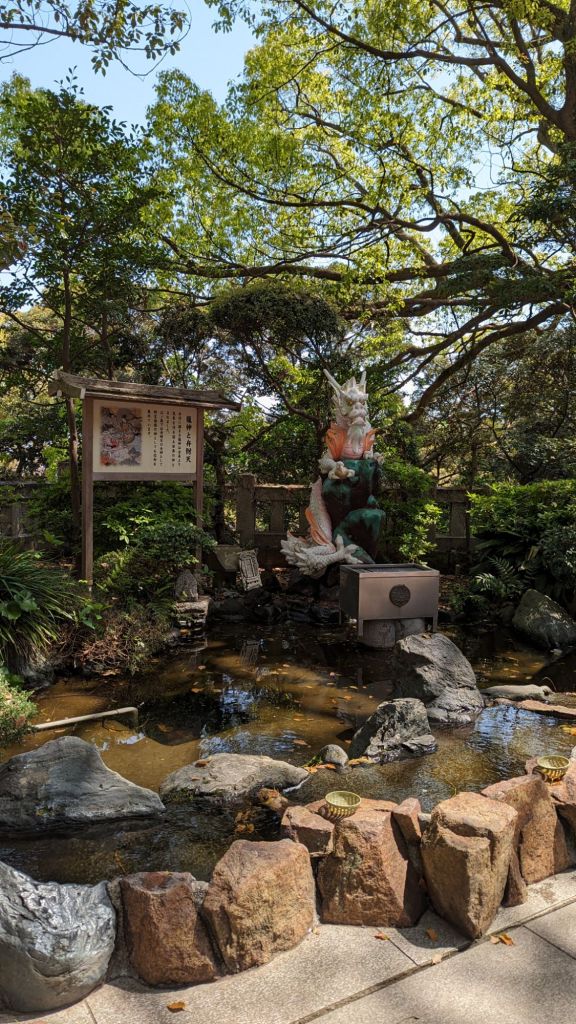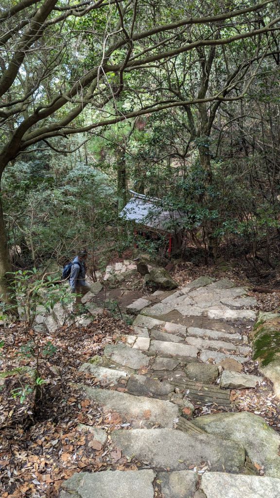 Erster Spot ist der Schrein der Insel. Zu diesem komme ich über diese schmale Passage. Danach geht’s den Berg hinauf. Wow, sehr schön sieht dies alles hier aus. Und dank der Verspätung, habe ich mir durch ChatGPT noch ein paar Infos zu der Insel geben lassen. Deswegen weiß ich, ein Drache spielt hier eine bedeutungsvolle Rolle.