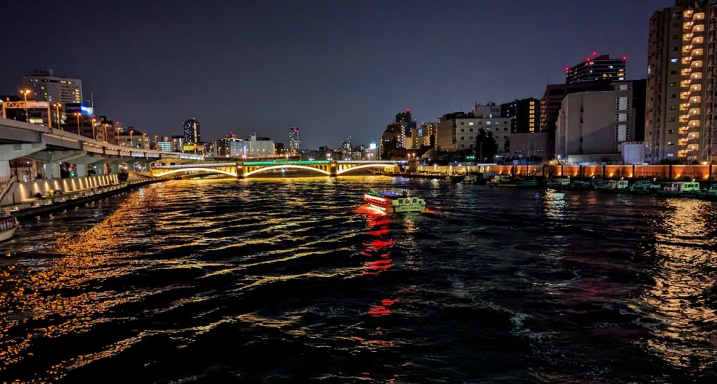 Jetzt stehe ich gerade auf der Brücke über den Sumida-River und bin begeistert von der Aussicht. Kurz genießen, Foto machen und …. noch mal genießen. Dann laufe ich weiter. Mir fällt im Übrigen auf, scheinbar sind hier alle Brücken anders beleuchtet. Alleine dies wäre schon eine nächtliche Erkundung wert.