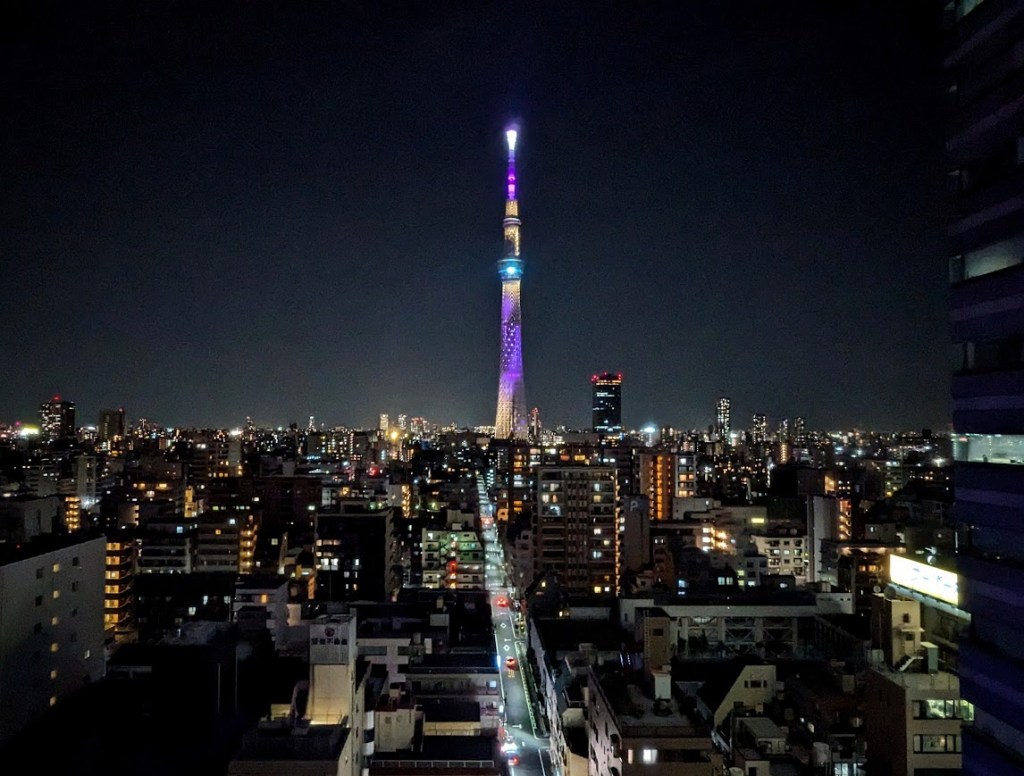 20:00 Uhr: Ich bin endlich im Hotel angekommen. Jetzt rauchen die Füße. Aber ich kann sie gemütlich hochlegen und den Ausblick aus meinem Fenster genießen. Von diesem sehe ich den Skytree, mit seinem wechselnden abendlichen Farbspiel. Dies ist der Grund, warum dieses Hotel eines meiner Lieblingshotels in Tokio ist. Ich bin diesmal schon das dritte Mal hier. Ich liebe dies.