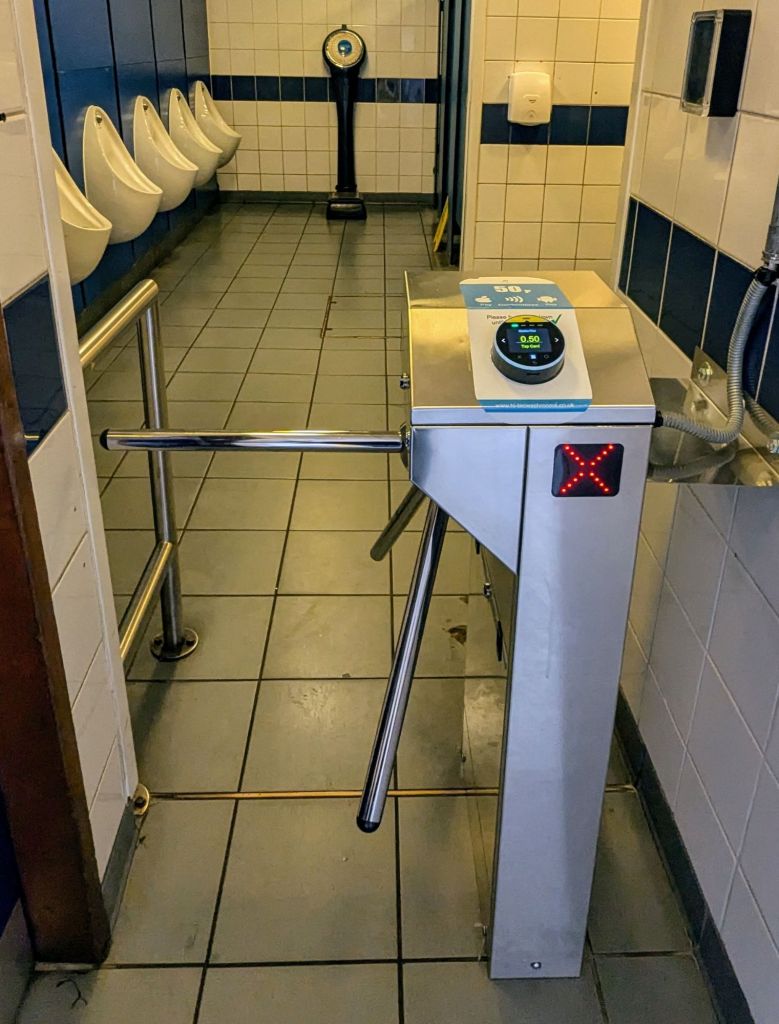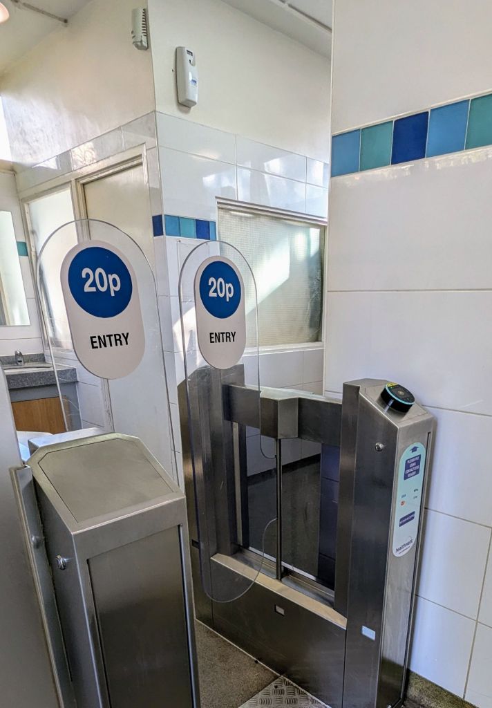 Wir haben ja in der Zwischenzeit herausgefunden, dass es in Parkanlagen auch immer Toiletten gibt. Diese hier sind aber leider nicht kostenfrei, sondern kosten 20 Pences. Bargeld wird aber auch hier nicht mehr genommen. Man kann die Toiletten nur nutzen, wenn man mit der Karte bezahlt. Willkommen im bargeldlosen Zeitalter. Kann ich nur unterstützen, da dies auf jeden Fall hygienischer ist.