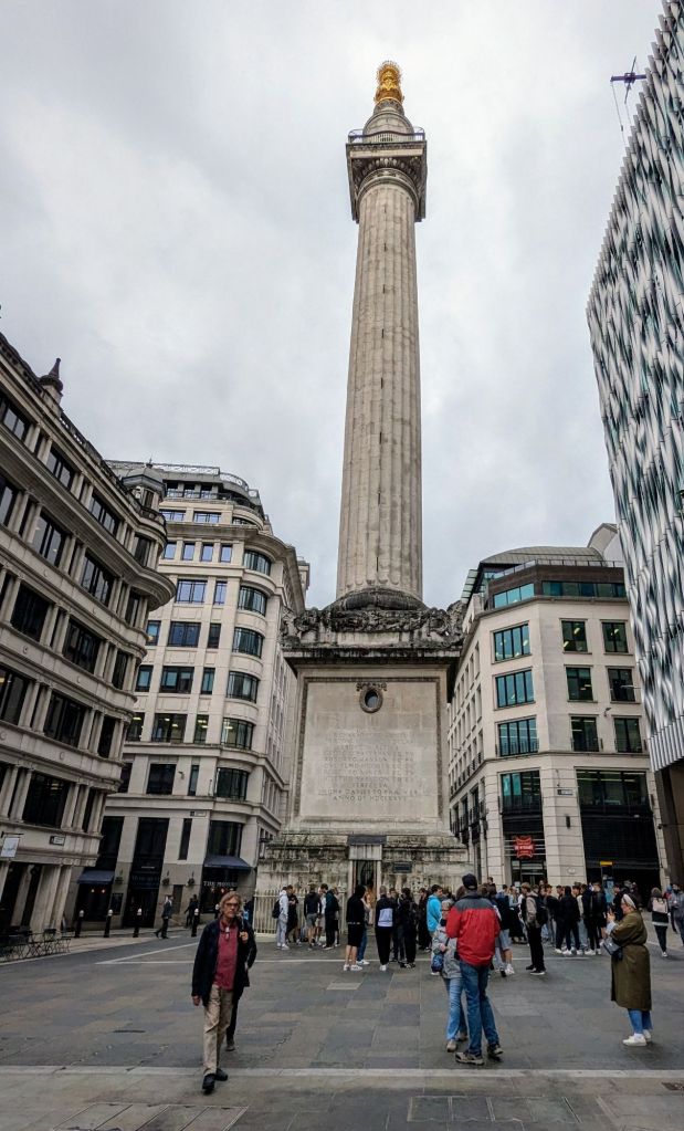 Da sind wir doch glatt per Zufall am Monument of Great Fire vorbeigekommen, eine imposante Säule mit Aussichtsplattform, die an den großen Brand von 1666 erinnert. Damals wurde nahezu ganz London durch den Brand vernichtet, weswegen es kaum alte Gebäude aus dem Mittelalter in London gibt.